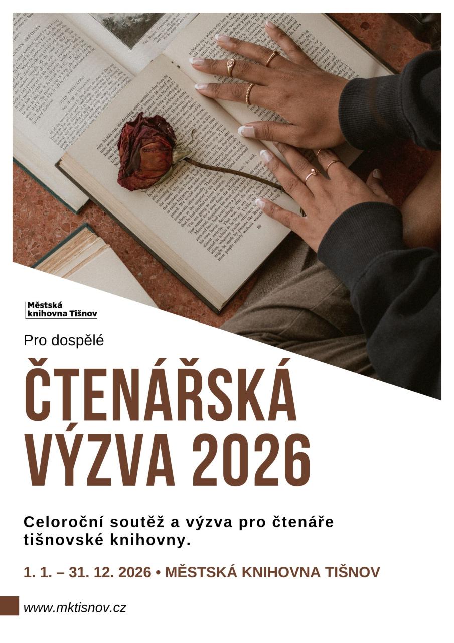 Nevěnujete čtení tolik času, kolik byste chtěli? Nevíte, co číst? Nebo jen chcete čelit výzvě? Městská knihovna Tišnov vyhlašuje další ročník Čtenářské výzvy. Tato celoroční soutěž začíná 1. ledna a končí 31. prosince 2026. Do výzvy se může zapojit každý registrovaný čtenář Městské knihovny Tišnov. Přihlášení je možné v knihovně v otevírací době dospělého oddělení: po, st, pá 8.00–18.00 hodin (mimo prázdniny a svátky). → Více o soutěži