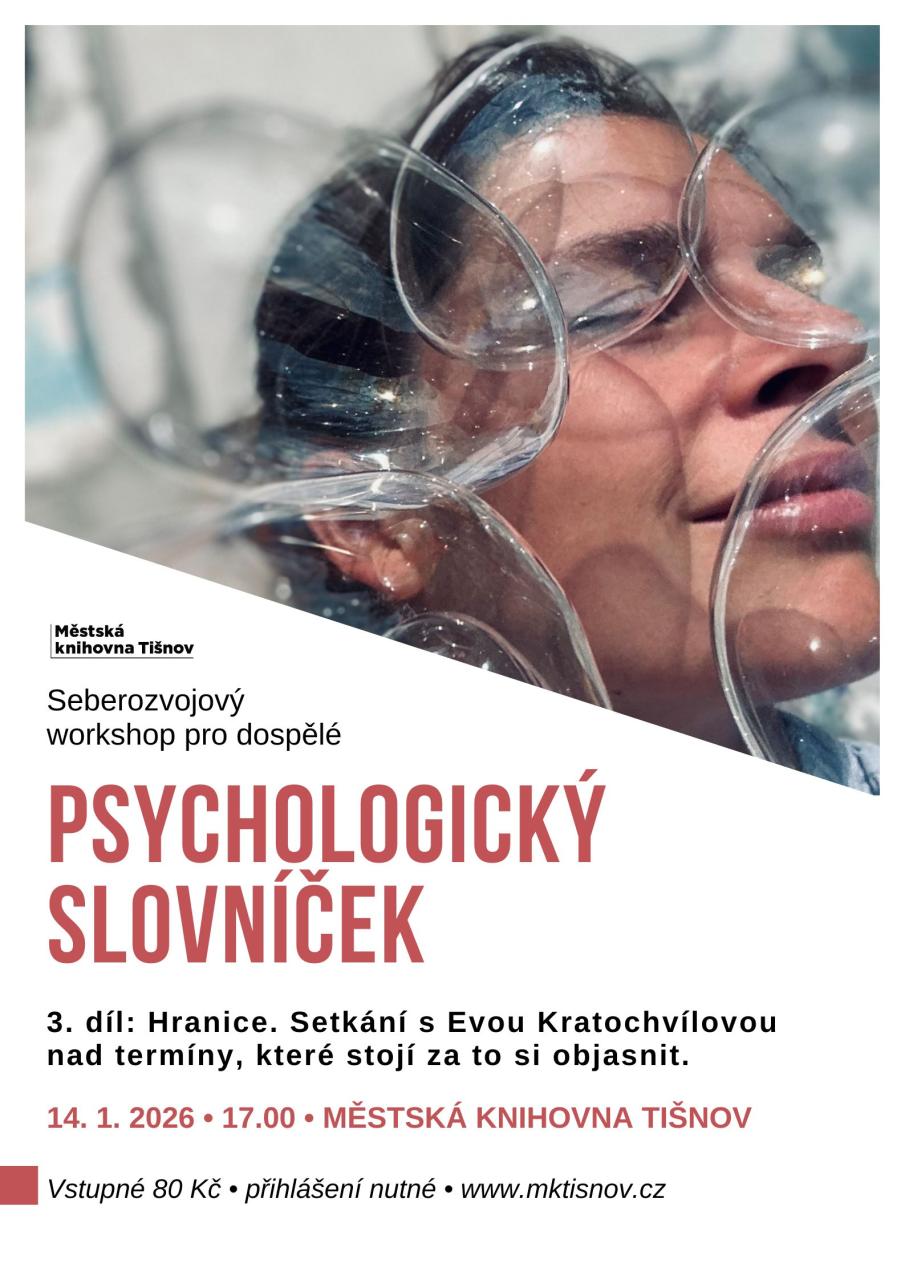 Seberozvojové workshopy s Mgr. MgA. Evou Kratochvílovou obsahují teoretickou a sebezkušenostní část. Přihlaste se, prosím, na e-mail → kamila.vejrostova@kulturatisnov.cz. Platba (80 Kč/osoba) je možná pouze v hotovosti přímo v knihovně.