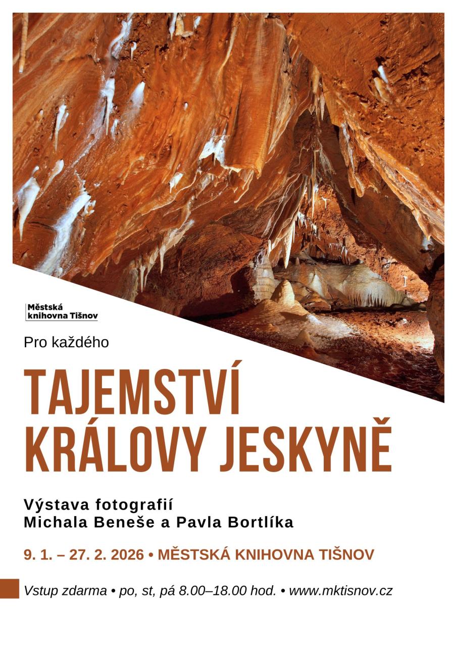 K vidění budou fotografie prostor Královy jeskyně, které byly objeveny v letech 1972–2022. Mimo jiné jde o Tišnovský dóm, Labyrint, Hrozivý dóm, Síň úžasu a Sintrové jezírko. Výstavu bude možné navštívit v otevírací době dospělého oddělení: po, st, pá 8.00–18.00 hodin. Vstup zdarma.