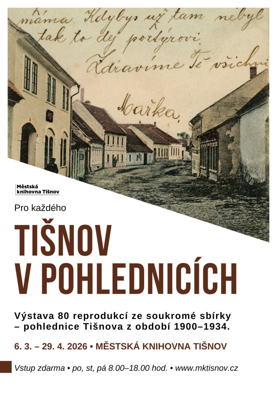 K vidění bude 80 pohlednic Tišnova (Kuthanovo sanatorium, ulice Brněnská, náměstí Míru i Komenského apod.) z období 1900–1934. Výstavu bude možné navštívit v otevírací době dospělého oddělení (po, st, pá 8.00–18.00 hod.).