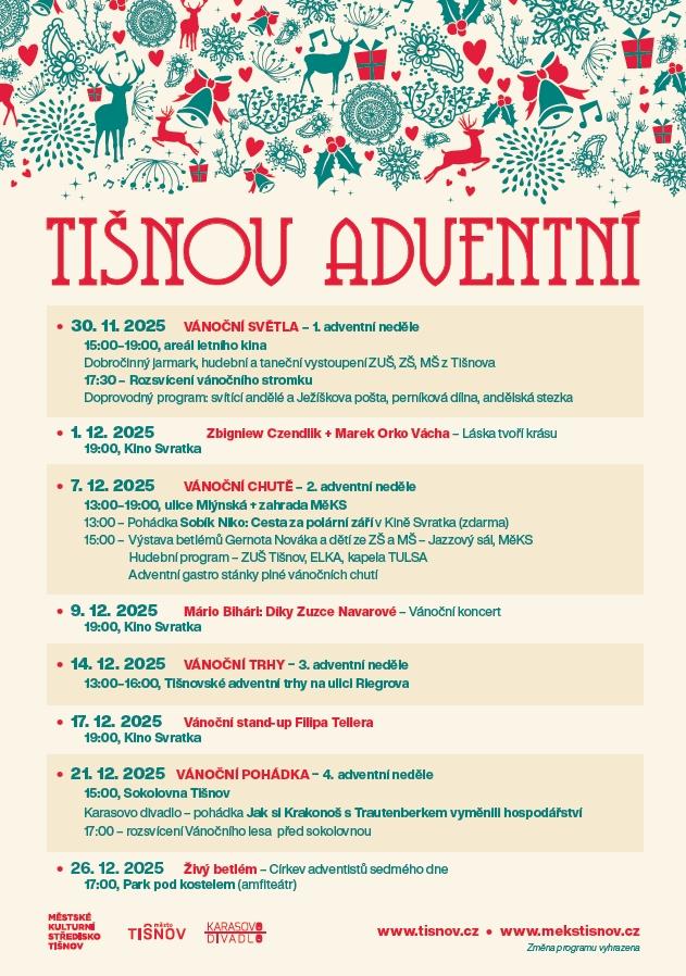 Na druhou adventní neděli 7. prosince vás zveme do prostor Městského kulturního střediska na Mlýnské ulici, kde rozsvícenou adventní atmosférou zavoní nejrůznější pevné i tekuté pochutiny a vánoční speciality. V doprovodném programu jsme pro vás připravili animovanou pohádku v Kině Svratka (vstup zdarma), výstavu betlémů G. Nováka i dětí z tišnovských škol. Na přilehlé zahradě MěKS na venkovním pódiu pak během odpoledne vystoupí ZUŠ Tišnov, písničkářka ELKA a kapela TULSA.