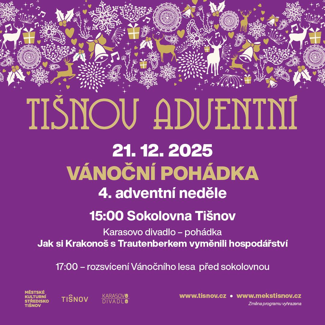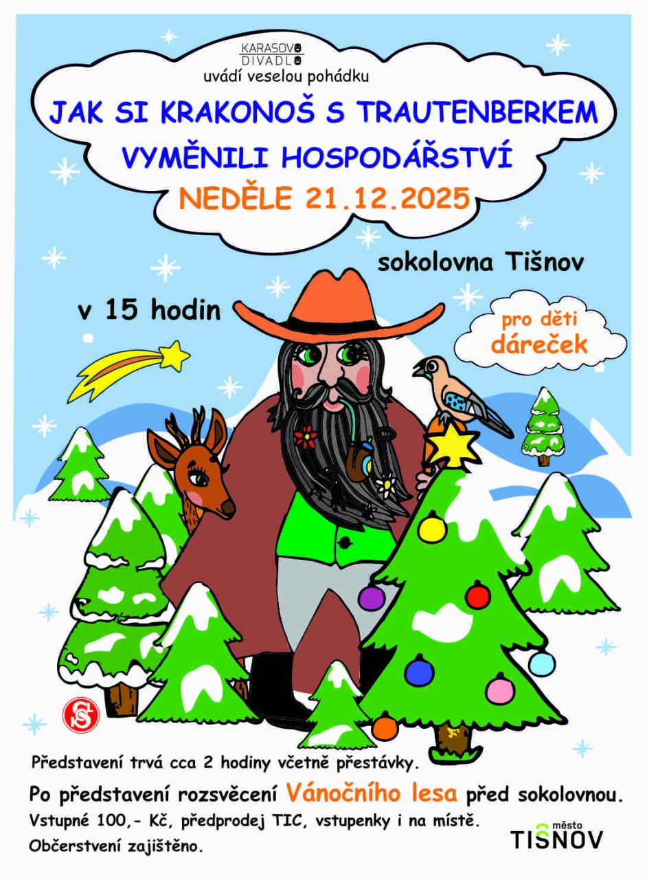 Jak si Krakonoš s Trautenberkem vyměnili hospodářství - tak se jmenuje nová pohádka, kterou o 4. adventní neděli 21. prosince v 15 hodin zahrají v tišnovské sokolovně ochotníci z Karasova divadla, a to nejen dětem. Po představení bude v prostoru před sokolovnou rozsvícen Vánoční les složený ze stromků, které vánočně ozdobili žáci tišnovských škol.