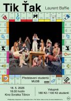 Divadelní komedii Tik Ťak napsal francouzský autor Laurent Baffie a v premiéře ji 18. května do Tišnova do sálu Kina Svratka přijede zahrát divadelní ateliér třídy MU3B ze Střední školy uměleckomanažerské (SŠUM) v Brně. Dramatický ateliér SŠUM od začátku vede a režíruje divadelní herečka Monika Eichmeier Maláčová (Národní divadlo Brno, HaDivadlo). Skupina deseti talentovaných studentů ateliéru má už za sebou dvě úspěšná ročníková představení – klasickou anglickou komedii Škola pomluv (2024 – Divadlo Barka) a Za zdí Brook Valley – divadelní hru N. R. Nashe z prostředí dívčí akademie (2025 – KC  Industra).