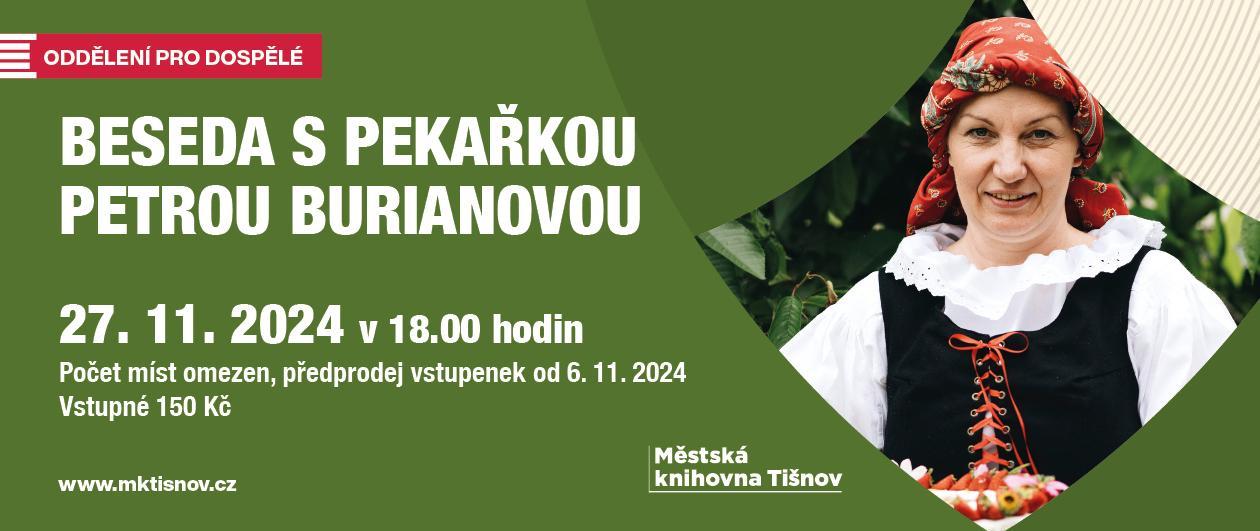 Beseda s pekařkou Petrou Burianovou… o pečení, tradicích, rodině a rituálech. Středa 27. 11. 2024 od 18 hodin (délka besedy 90 min). V tišnovské knihovně - oddělení pro dospělé, přednáškový sál. Přijďte si pro pohlazení po duši. Petra Burianová, známá vítězka první řady soutěže Peče celá země a moderátorka pořadu Pečení na neděli, přijede do knihovny.