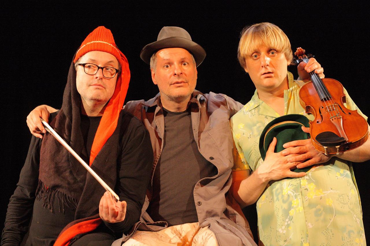 Trojice herců vstupuje na jeviště vždy bez předem daného scénáře. Průběh představení tak připomíná chůzi po laně, kde hrozí nebezpečí pádu a zároveň, když se vše daří, máte pocit, že se dotýkáte hvězd. Situace, postavy, zápletky, charaktery, písničky i tance, to vše se rodí až na jevišti přímo ve světlech právě vznikajícího představení.