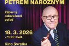Ve středu 18. března 2026 přivítáme v sále kina Svratka od 19. hodin jednoho z nejpopulárnějších českých herců, komiků, vypravěčů a moderátorů, pana Petra Nárožného.