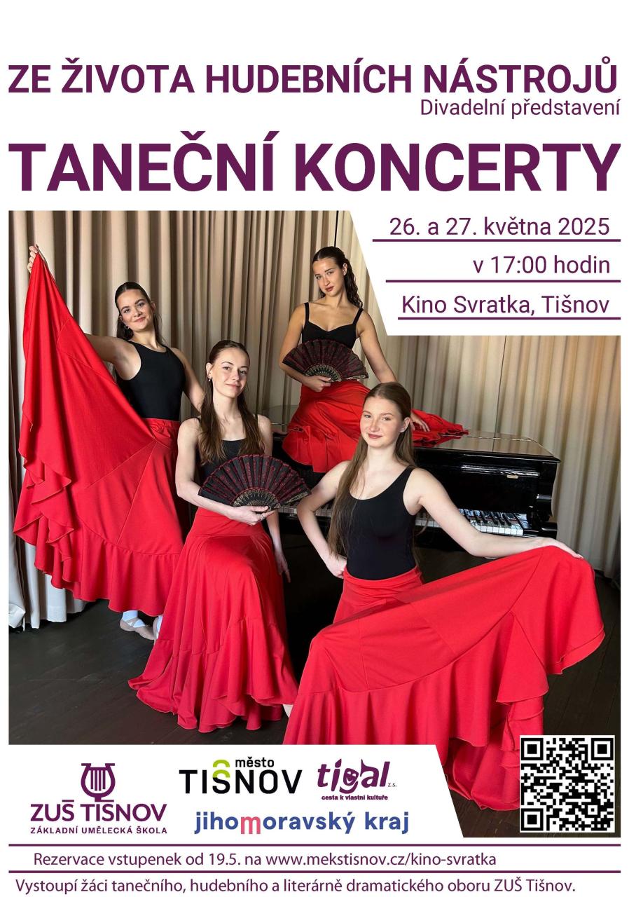 Tak jako každý rok, i letos Vás ZUŠ Tišnov zve na Taneční koncerty. V Kině Svratka vystoupí žáci tanečního oboru ZUŠ. Program koncertů zahájí mezioborová představení 26.5. a 27.5. ZE ŽIVOTA HUDEBNÍCH NÁSTROJŮ – dramatické vystoupení. Jak vypadají, jak se na ně hraje, jak zní, čím nás hudební nástroje překvapí ? To vše se dozvíte v představení Dramatického oboru a Hudebního oboru. TANEČNÍ KONCERTY - opět nádherná, zajímavá a okouzlující podívaná tanečních kreací žákyň Tanečního oddělení. Vstupné 180,- Kč, pro dospělé i děti. Doprodej vstupenek v Kině Svratka 30 minut před začátkem koncertu.